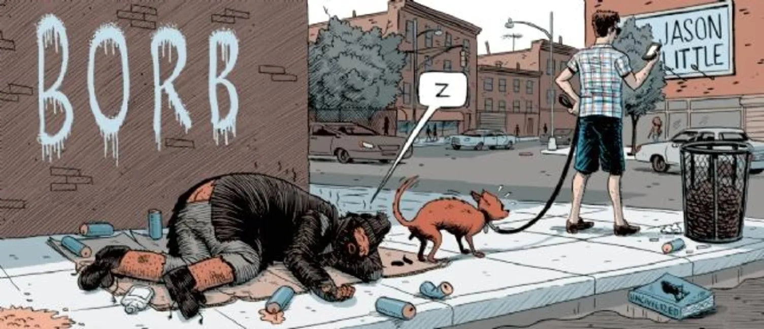 Borb by Jason Little (Shutterbug Follies, Motel Art Improvement Service) is the story of Borb, a severely alcoholic homeless man. Borb is a downtrodden urban Candide whose misfortunes pile up at an alarming rate. The narrative is presented as a series of daily newspaper strips as the author draws on the long and complex tradition of the comic strip slapstick vagabond archetype. At once hilarious, horrifying, and full or heart, Borb depicts the real horrors specific to present-day urban homelessness. Borb is Little's most complex and challenging work.