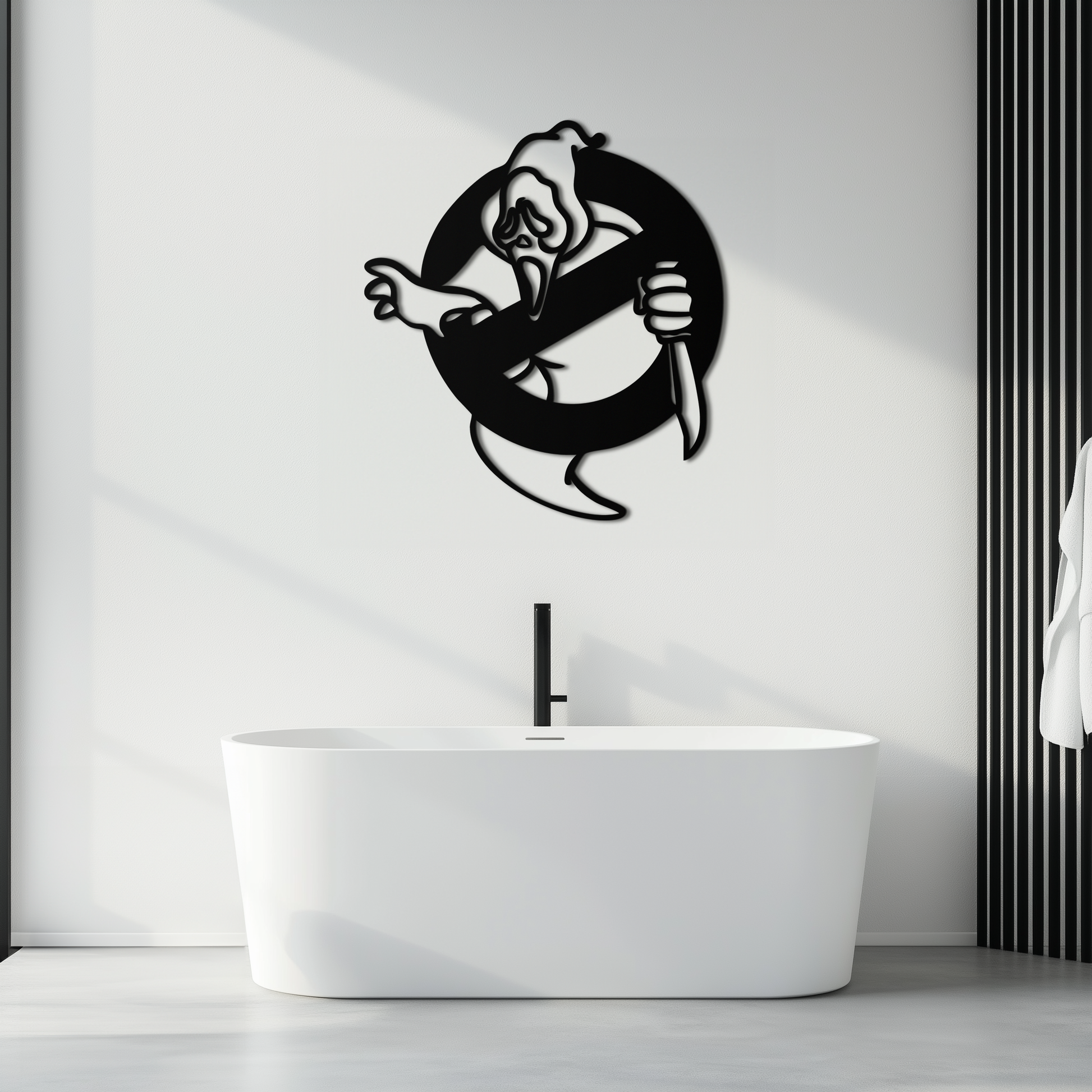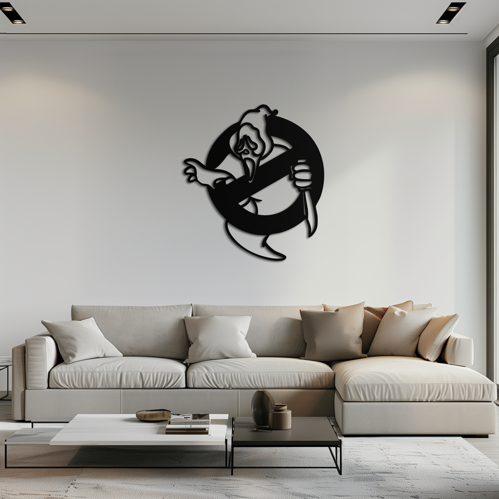 Add a bold and eerie touch to your space with this Ghost Scream Inspired Metal Wall Art. Combining horror elements with pop culture parody, this piece features a ghostly figure wielding a knife and breaking through a symbolic no-entry circle. Perfect for fans of thrillers, parodies, or Halloween decor, this design makes a unique statement in any room. Laser-cut from high-quality metal, it’s powder-coated for a durable and striking finish.