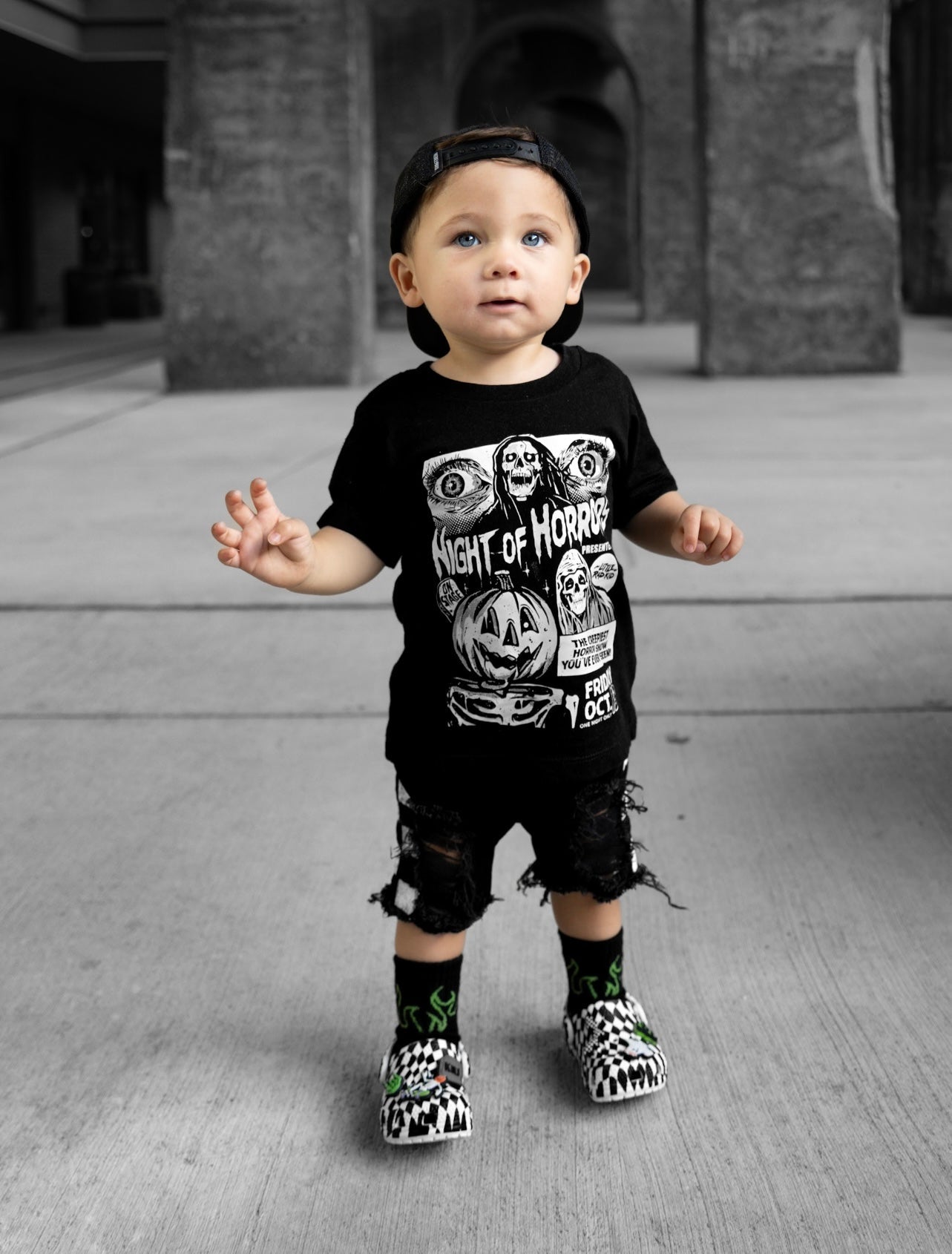 Step into the scene—our Night of Horror Tee brings vintage movie vibes to spooky season. Inspired by old-school horror film posters, this shirt mixes chills with thrills for the ultimate Little Rad Kid look. Made from soft, breathable cotton, it’s comfy enough for a full day of adventures—whether that’s trick-or-treating or just stealing candy from mom’s stash.